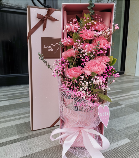 材质 11枝粉色康乃馨,粉色满天星,尤加利叶搭配