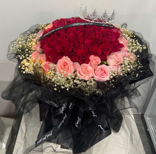 材质: 99枝红粉玫瑰混搭,1个皇冠,彩灯,满天星搭配