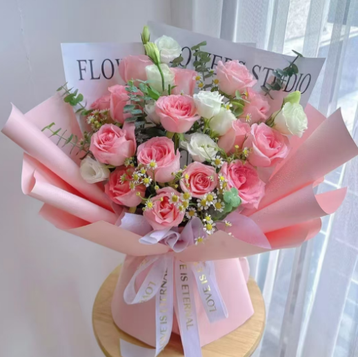 材质: 19朵戴安娜玫瑰 桔梗,小雏菊,尤加利叶搭配