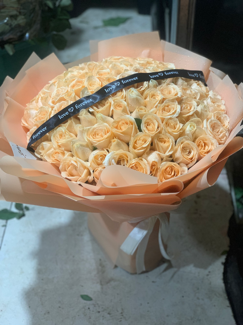 材质 精选99枝香槟玫瑰,组成美丽花束。