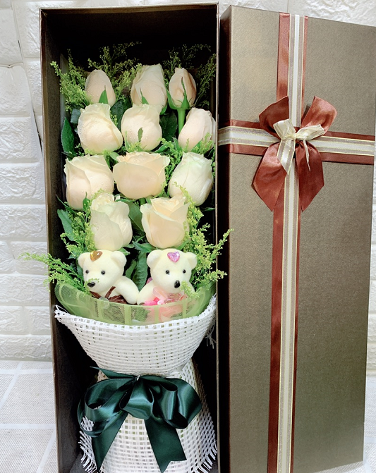 材质: 11枝香槟玫瑰,搭配黄英 2只小熊