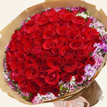 材质: 66枝优质顶级昆明玫瑰,相思梅/满天星/黄莺外围。