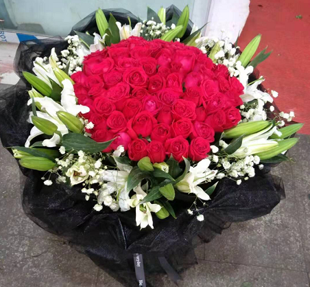 材质: 精选66枝红玫瑰,33朵白百合围边,满天星点缀