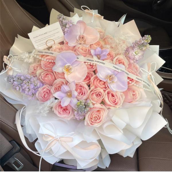 | 材质: | 33枝粉玫瑰,3枝蝴蝶兰,2枝郁金香喷色, 4枝紫罗兰,白色蓬莱松,丝带搭配 |