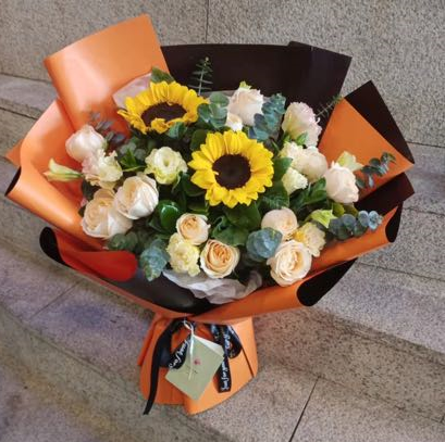 材质 向日葵2朵,11支香槟玫瑰,洋桔梗 栀子叶 尤加利叶搭配