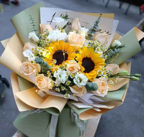 材质 11枝香槟玫瑰,2只向日葵,彩灯,3枝白色洋桔梗,洋甘菊,尤加利叶丰满,按图制作