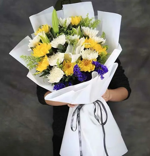 材质: 8朵白菊,8朵黄菊,4朵白百合,勿忘我,黄英搭配