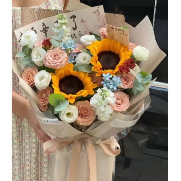 材质: 精选11枝卡布奇诺玫瑰,2枝向日葵,2枝白色紫罗兰,