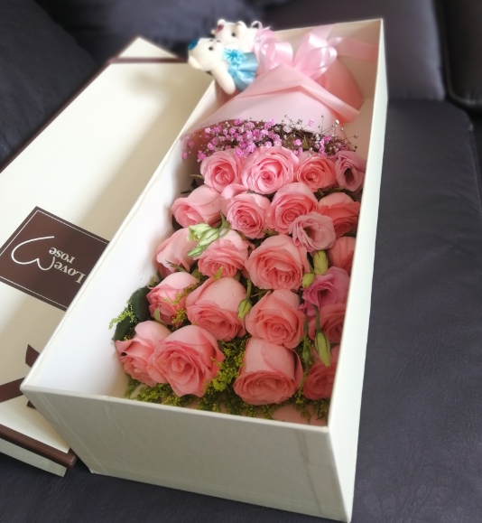 材质: 21朵戴安娜玫瑰,2只可爱小熊,洋桔梗,黄莺,满天星搭配