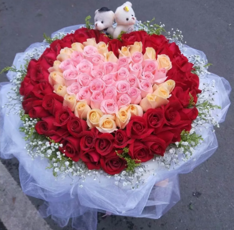 | 材质: | 28枝粉玫瑰内层摆成心型, 22枝香槟玫瑰围在中层, 49枝红玫瑰外围一圈 共99枝,搭配2只小熊,黄英满天星围边 |