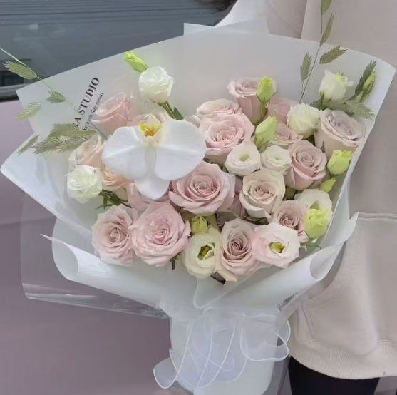材质: 精选19枝曼塔玫瑰,1枝蝴蝶兰,桔梗,绿叶搭配