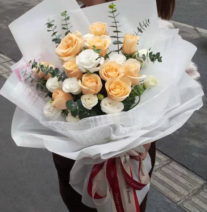 材质: 精选11枝香槟玫瑰,桔梗丰满,尤加利叶搭配