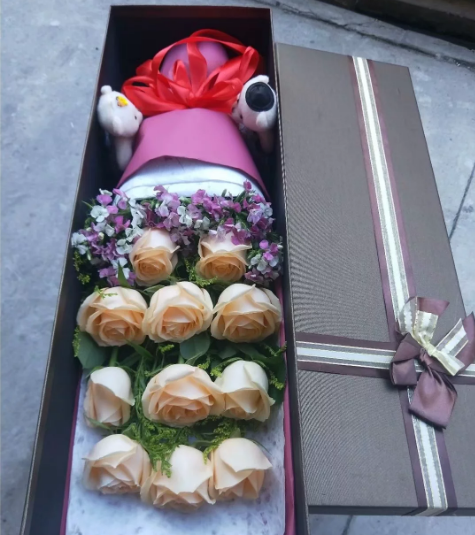 材质: 精选11枝香槟玫瑰,2只小熊,黄英相思梅搭配