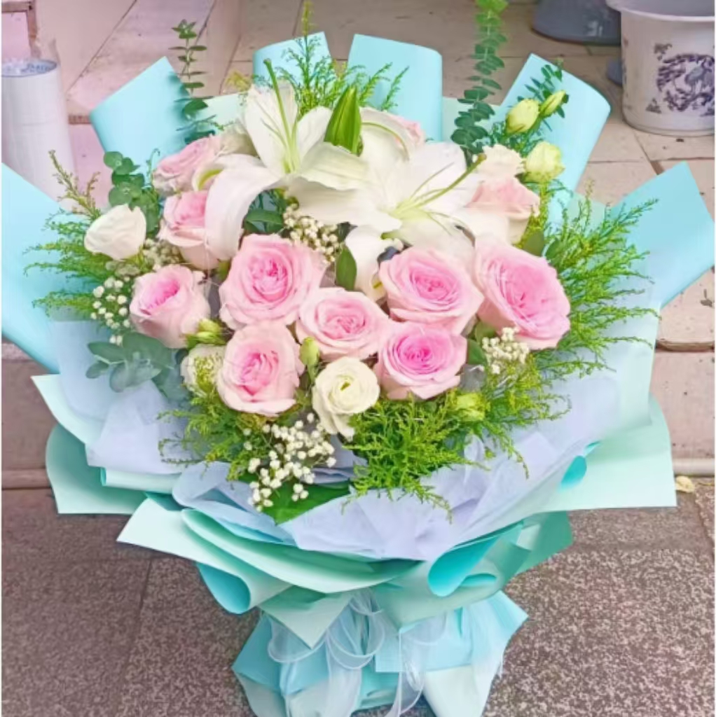 材质: 11枝粉玫瑰,2枝多头百合,桔梗,黄英,满天星,尤加利叶搭配