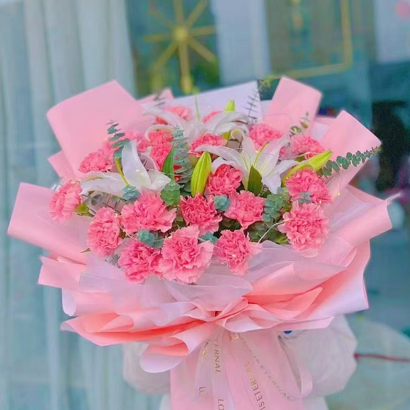 材质: (彩灯)精选21朵粉色康乃馨,2枝多头百合,尤加利叶搭配