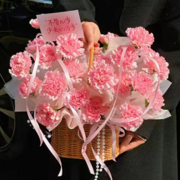 材质: 精选21朵粉色康乃馨单支包扎,丝带搭配,