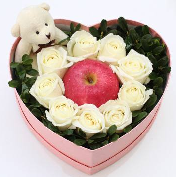 材质: 精选9枝白玫瑰,1颗苹果,1只小熊,