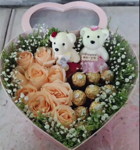 材质: 精选9朵香槟玫瑰,9颗巧克力,2只小熊