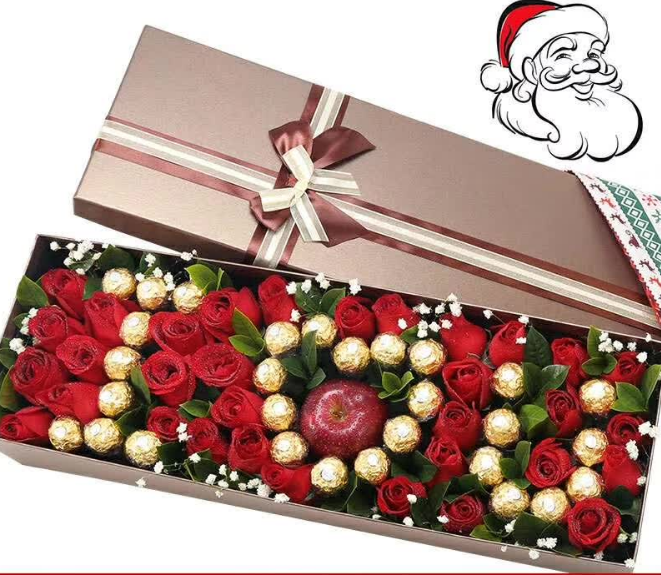材质 精选33朵红玫瑰,28颗巧克力,拼出“”I O U"字样1个苹果,栀子叶 满天星搭配