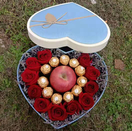 材质: 精选11枝红玫瑰,11颗巧克力,1颗苹果,情人草围边