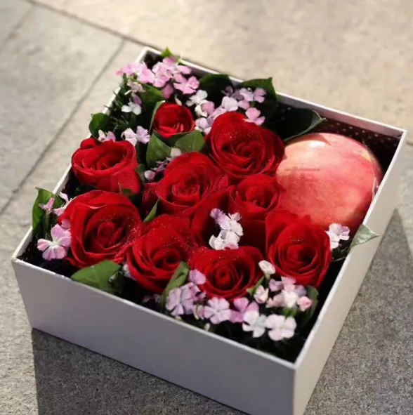 材质: 精选9朵红玫瑰,一颗苹果。相思梅 绿叶搭配
