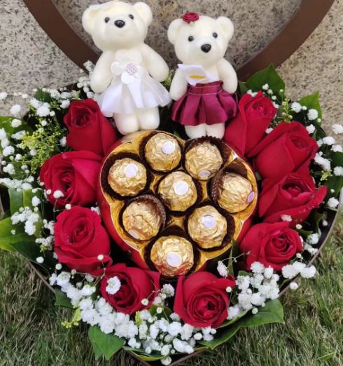 材质: 精选9朵红玫瑰 8颗巧克力 2只小熊,满天星黄英搭配