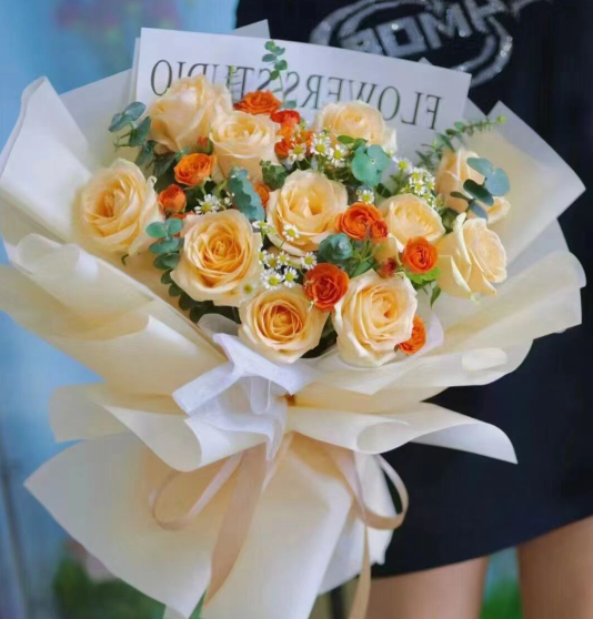 材质: 11香槟玫瑰,橙色泡泡,洋甘菊,尤加利叶搭配