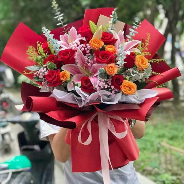 材质 11枝红玫瑰,5朵百合,3枝橙色泡泡,