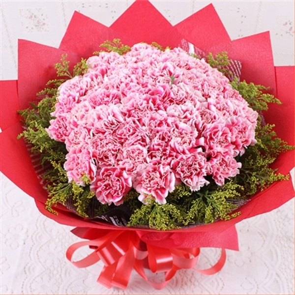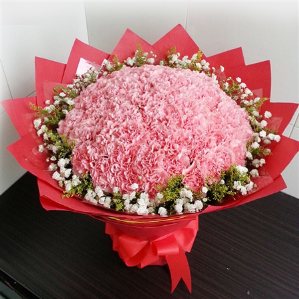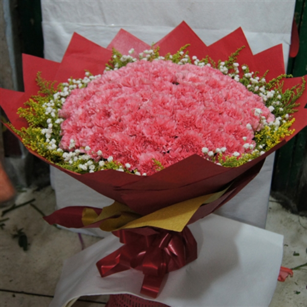 | 材质: | 精心挑选66朵优质康乃馨,黄莺,满天星点缀。 | ||||