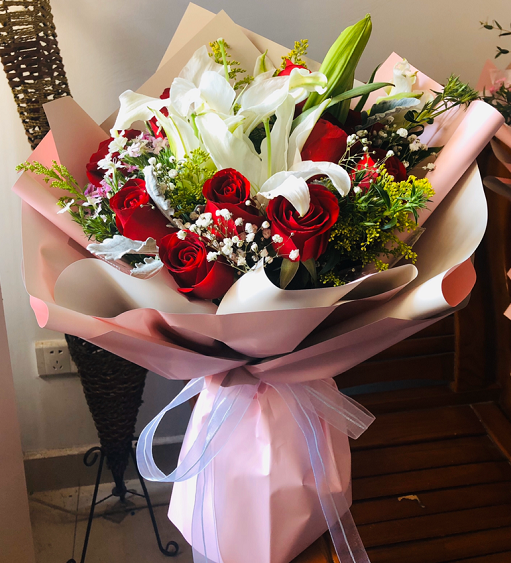 材质: 精选11枝红玫瑰,6朵白百合,黄英,满天星,相思梅点缀