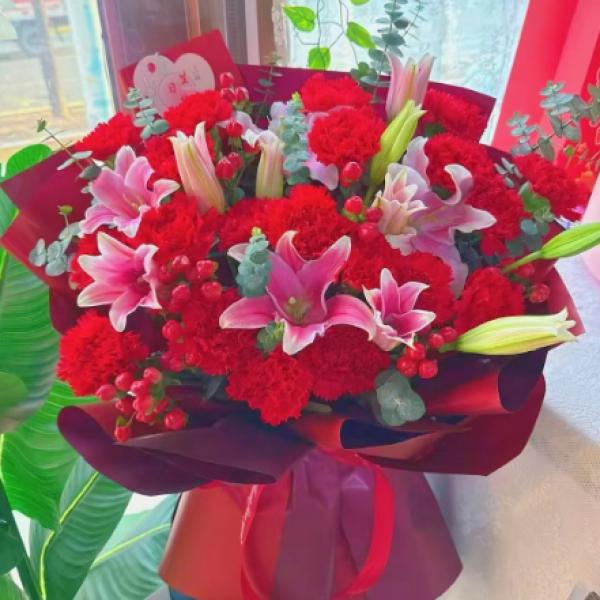 材质: 20朵红色康乃馨,13朵粉百合,尤加利叶,红豆搭配