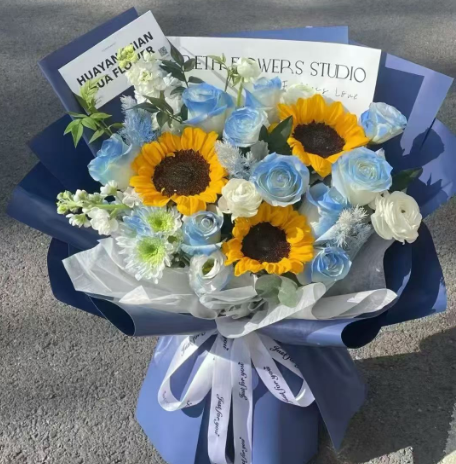 材质: 精选3枝向日葵,11枝碎冰蓝玫瑰,2枝白色紫罗兰,小菊,桔梗,蓬莱松,七星叶搭配