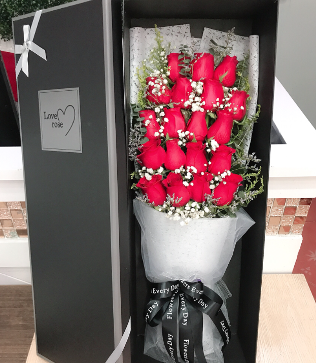 材质 19枝红玫瑰,满天星,黄莺,情人草,尤加利叶搭配