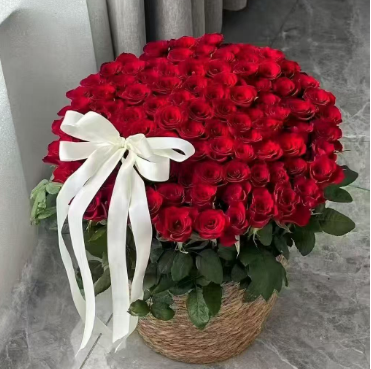 材质 99枝红玫瑰 ,两根丝带系蝴蝶结,七星叶搭配,草编抱抱桶