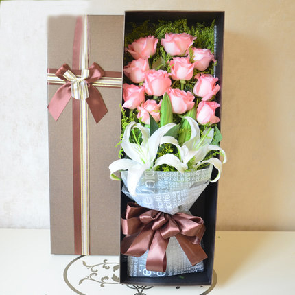 材质: 11枝粉玫瑰 2枝百合, 黄英。绿叶搭配