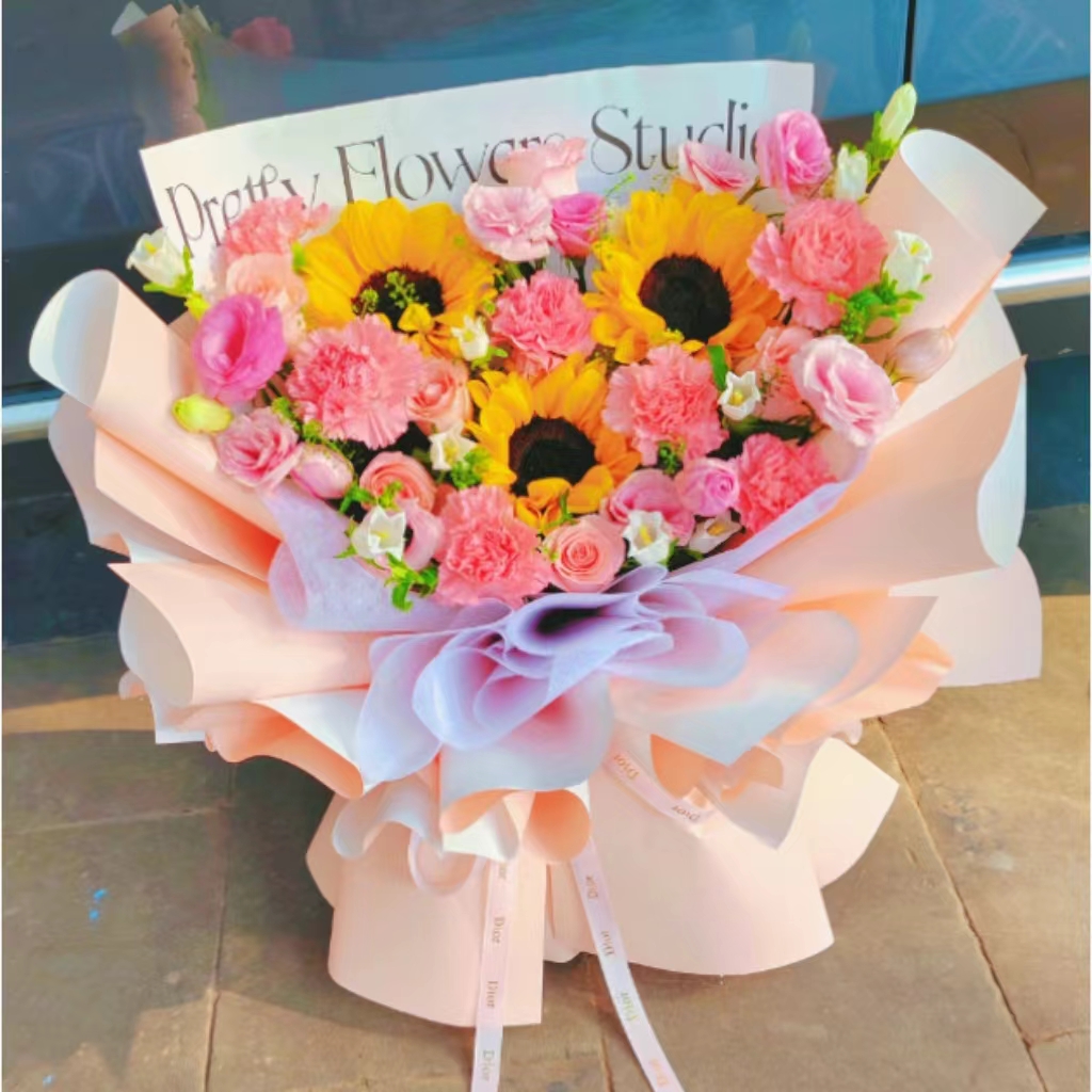 材质: 8枝戴安娜,11枝粉色康乃馨,3枝向日葵,