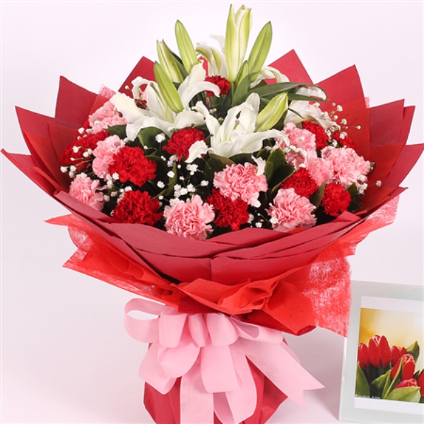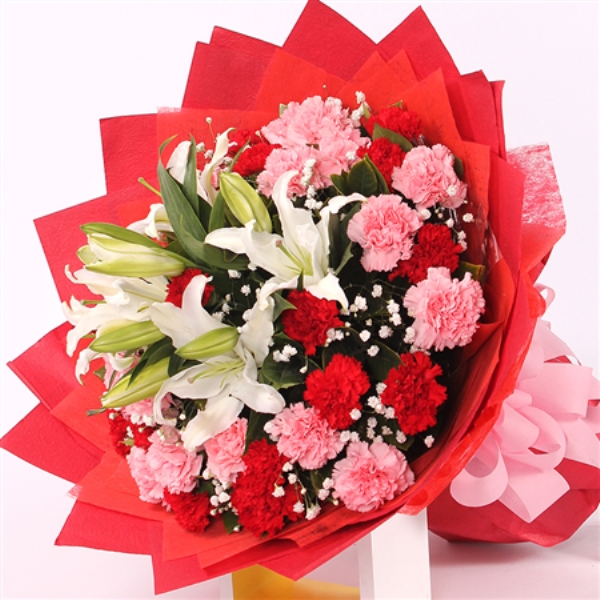 | 材质: | 精心挑选11朵红色康乃馨和11朵粉色康乃馨,6朵百合,搭配栀子叶、满天星。 |