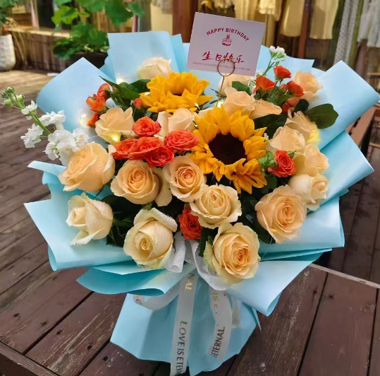 材质: 19枝香槟玫瑰,2枝向日葵,3枝橙色泡泡,2枝白色紫罗兰,绿叶搭配
