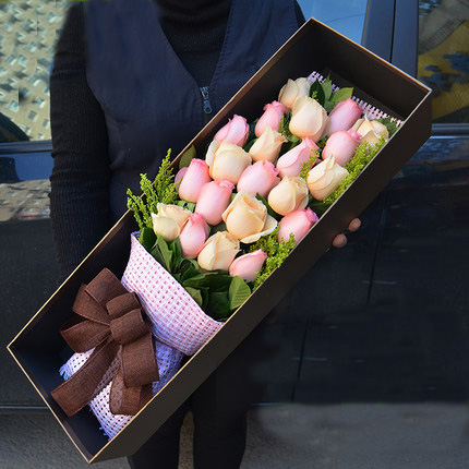 | 材质: | 11枝粉玫瑰 10枝香槟玫瑰,黄英 栀子叶搭配 |