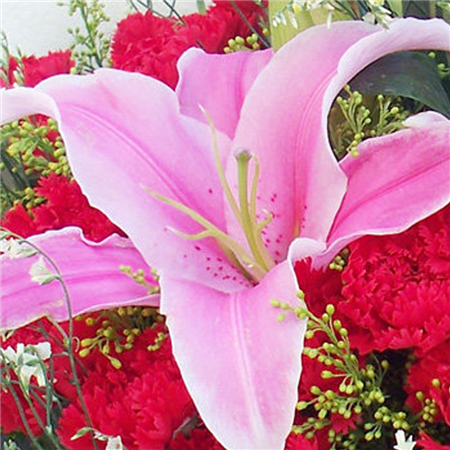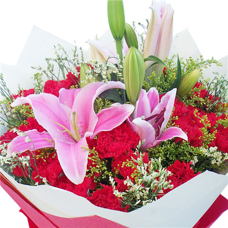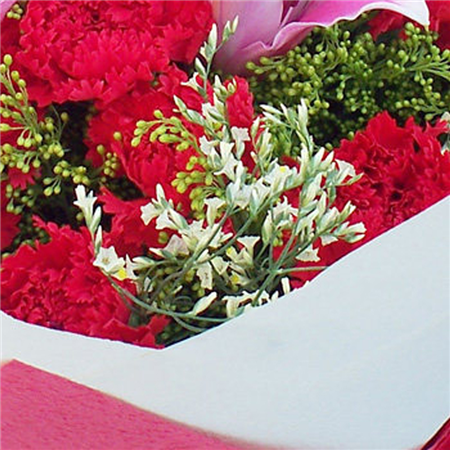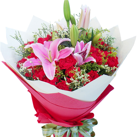 材质: 19枝红色康乃馨,6朵粉色百合,搭配水晶草,黄莺