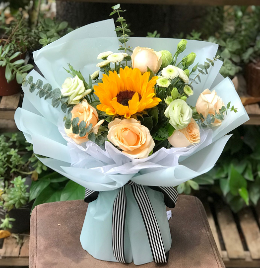 材质: 1枝向日葵,5枝香槟玫瑰,洋桔梗,小雏菊,尤加利叶搭配