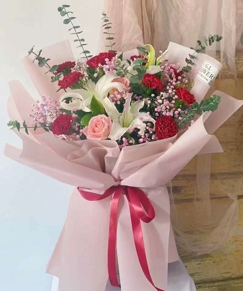 材质: 精选11枝红色康乃馨,2枝粉玫瑰,2枝多头百合,粉色满天星,尤加利叶搭配