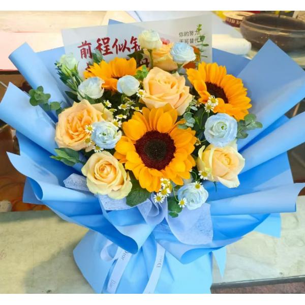 材质: 3枝向日葵,5朵香槟玫瑰,尤加利叶,小雏菊,桔梗喷蓝色搭配