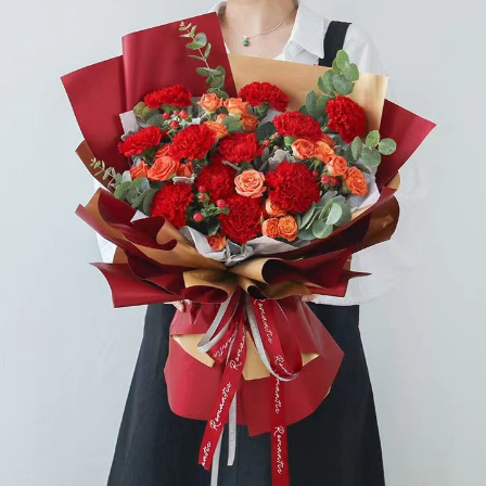 材质: 11枝红色康乃馨,4枝狂欢泡泡,红豆,尤加利叶搭配