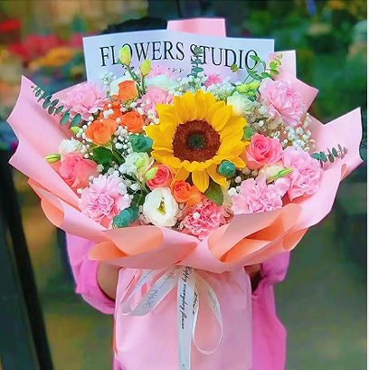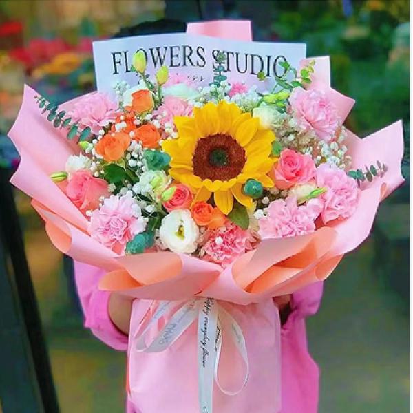 材质: 8枝粉色康乃馨,3枝戴安娜。1枝向日葵,桔梗,