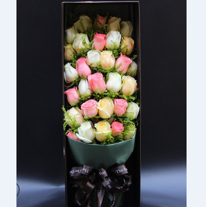 | 材质: | 精选11枝白玫瑰 11枝戴安娜玫瑰 11枝香槟玫瑰 一共33朵玫瑰混色搭配 黄英点缀 |