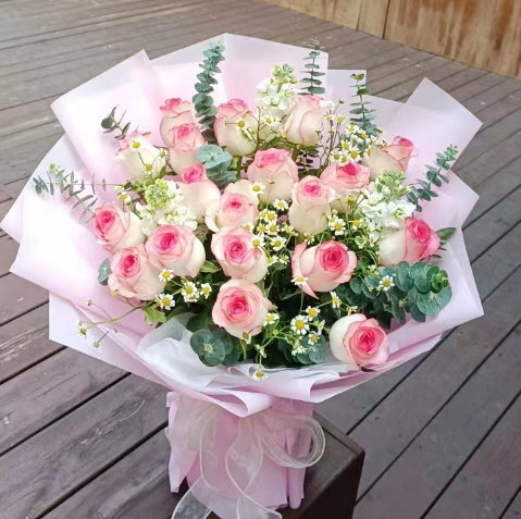 材质: 19枝爱莎玫瑰,洋甘菊,尤加利叶丰满