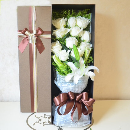 | 材质: | 11枝白玫瑰加2枝百合,黄英搭配 | ||||