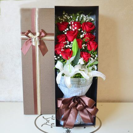 材质: 11枝玫瑰加3朵百合 黄英满天星搭配