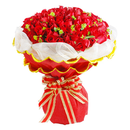 材质: 101枝红玫瑰,叶上金(或者黄莺草)点缀